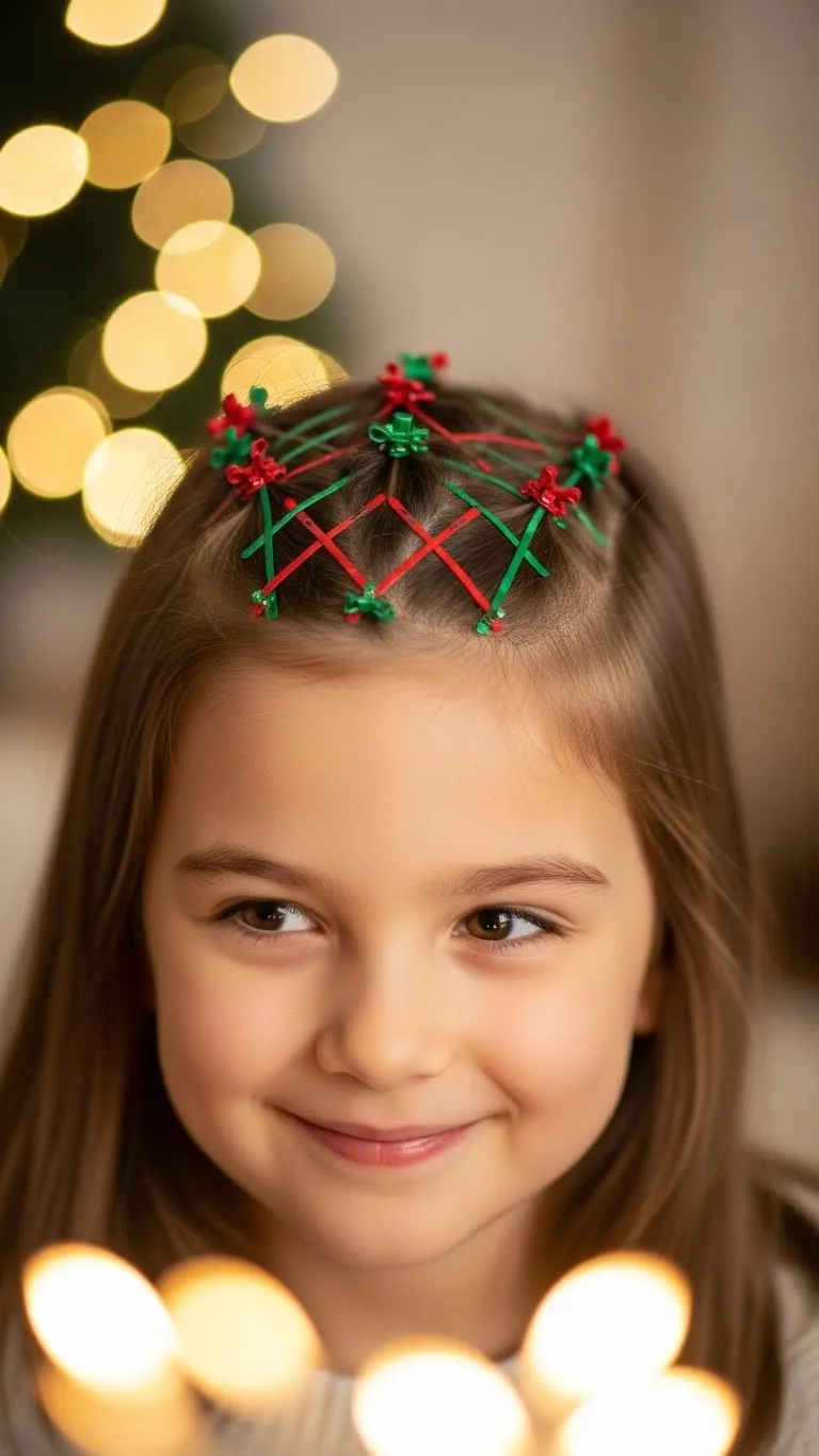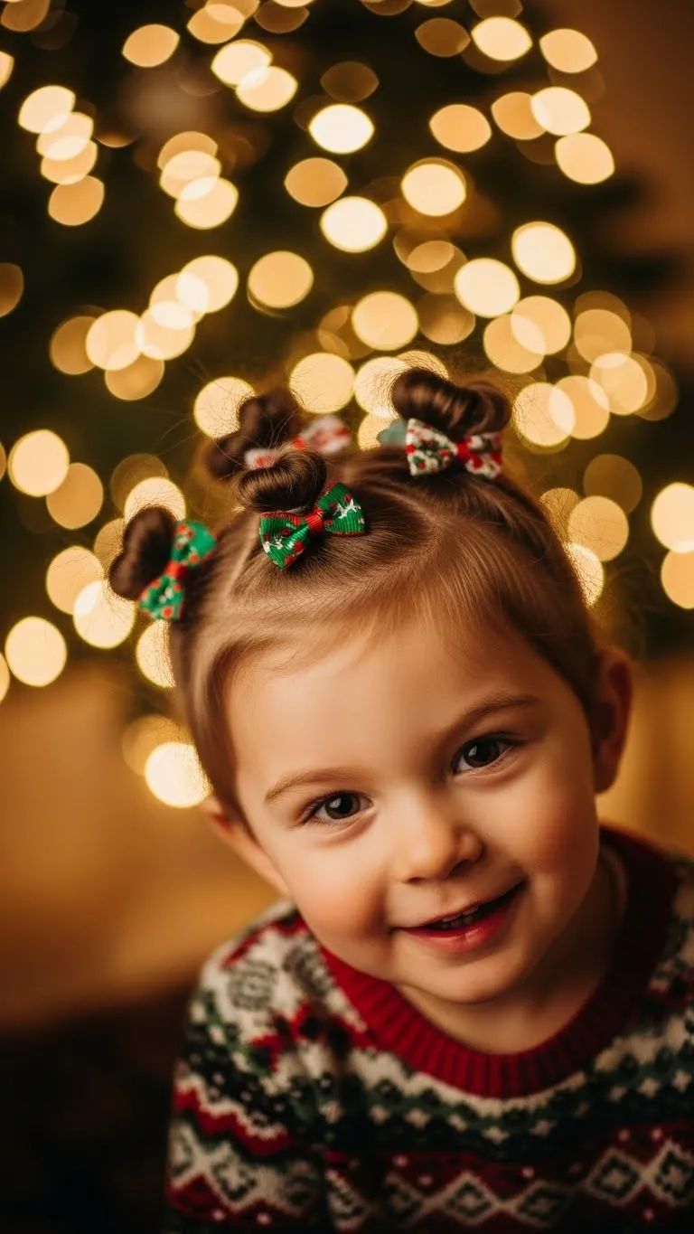 This style is perfect when you want something cute but not complicated. Part the hair down the middle, then create two small braids on each side. Pull them back and secure them with an elastic or small bow. Leave the rest of the hair down for a soft look. Add a green or red clip for a simple holiday accent. If you want extra texture, twist small sections of the loose hair using your fingers. This style stays tidy through most activities. It’s great for straight, wavy, or curly hair. Parents love how it keeps hair away from the face without pulling too tight. If your child dislikes long styling sessions, this is a relaxed option. It photographs beautifully and works well for casual gatherings.