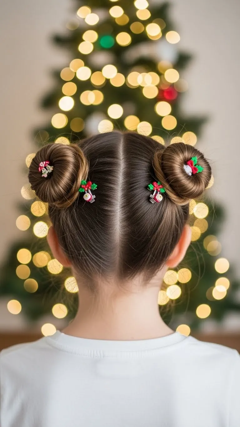 Space buns are always fun for kids. Part the hair into two halves and twist each into a bun. Secure with soft bands. Add festive clips or small bows for Christmas flair. This style works well for medium or long hair. It keeps hair off the face and feels light. Kids love the playful shape. If your child’s hair is thick, make the buns smaller so they stay secure. This is a great style for parties or holiday outings.