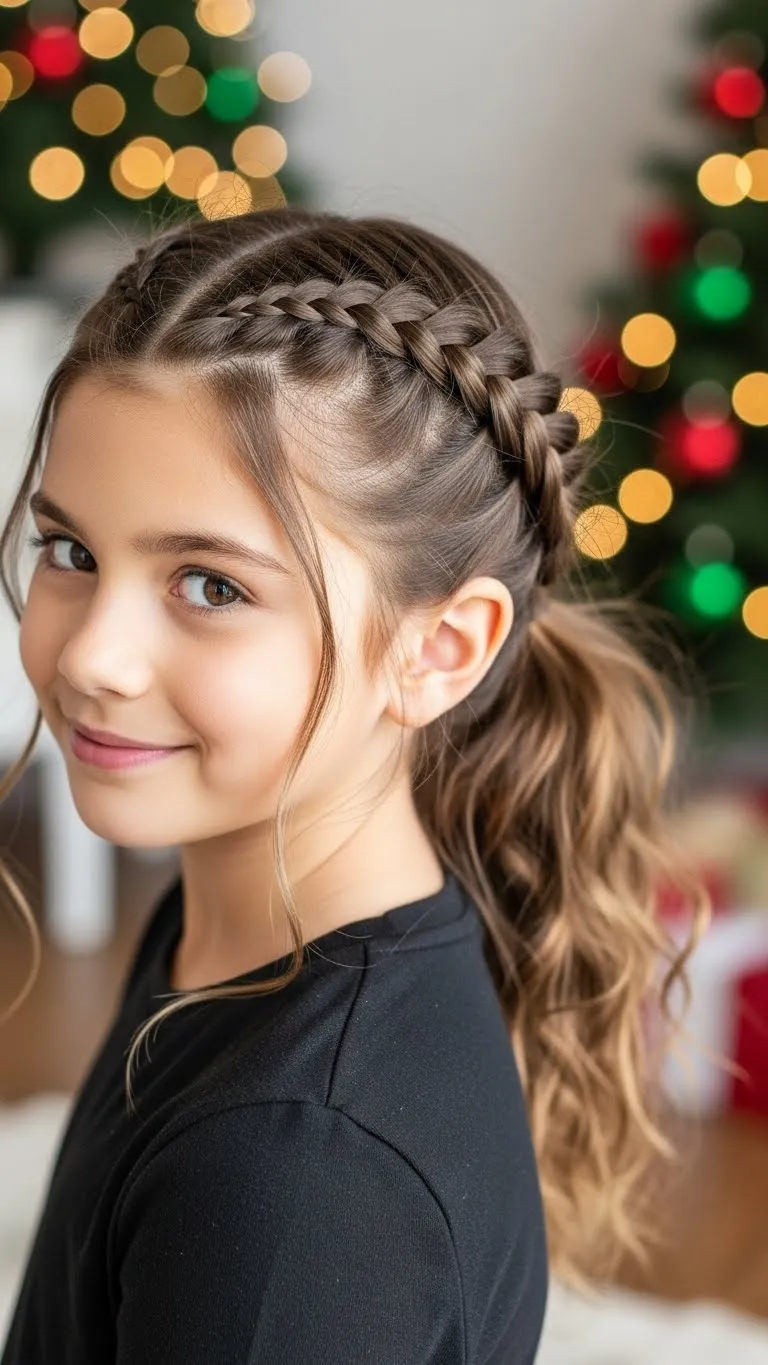 This hairstyle looks more detailed than it is. Make a ponytail, then take a small section from the bottom and braid it. Wrap the braid around the elastic and pin it. It hides the band and adds a polished touch. Add a small holiday bow at the end for color. This works great for medium and long hair. Parents like this option because it’s secure and stays neat. You can add curls at the bottom for extra softness.