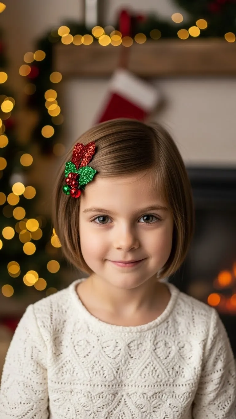A low bun is quick and tidy. Pull the hair into a low ponytail, twist it into a bun, and secure it. Add two or three holly-inspired clips for a seasonal touch. You can find inexpensive versions at most discount stores. This style works well for kids who want hair out of the way. It pairs nicely with cozy holiday outfits. For fine hair, tease the ponytail gently with a comb to create fullness. This is one of the easiest styles to create before heading out the door.