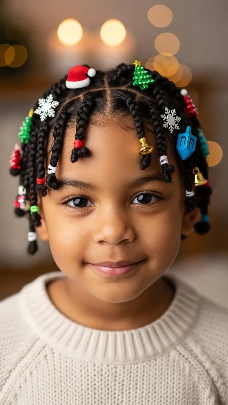 Tiny twists take little time and keep hair tidy. Create small sections and twist them individually. Add Christmas-themed clips such as stars, candy-cane colors, or little bows. This adds fun without much effort. Twists work on all textures and stay secure during play. For thick hair, twist damp sections for smoother results. For kids with shorter hair, you can twist just the front area and let the rest remain natural. These twists last for days, which helps during the busy season. It’s a helpful choice when you want a quick morning routine.