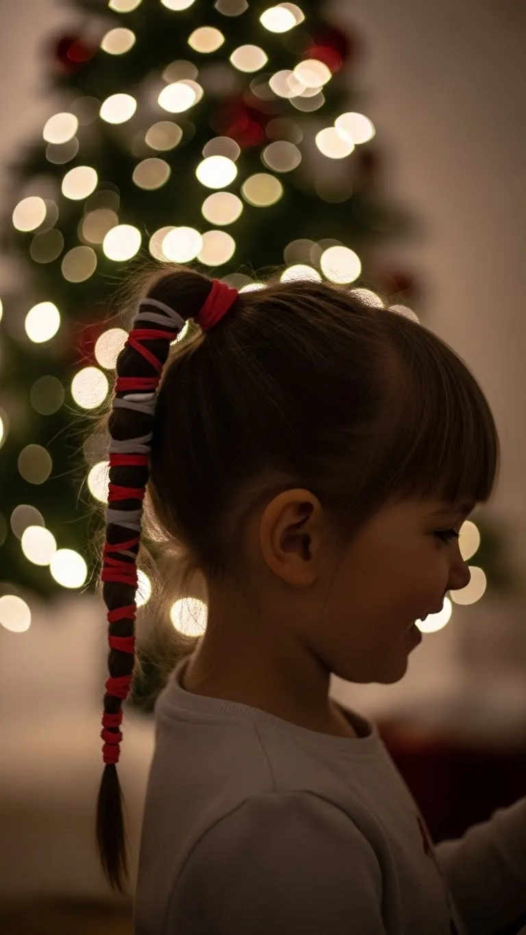 This ponytail is simple but festive. Make a high or mid ponytail and add mini elastics down the length of the hair. Alternate red and white to give a candy-cane effect. Kids love the fun look, and it only takes a few minutes. Use soft elastics to avoid discomfort. For extra flair, curl the ends by wrapping small sections around your finger. This style stays neat all day and works great for school celebrations. It’s also easy to redo if a band slips. Affordable and quick, it’s one of the simplest holiday looks.