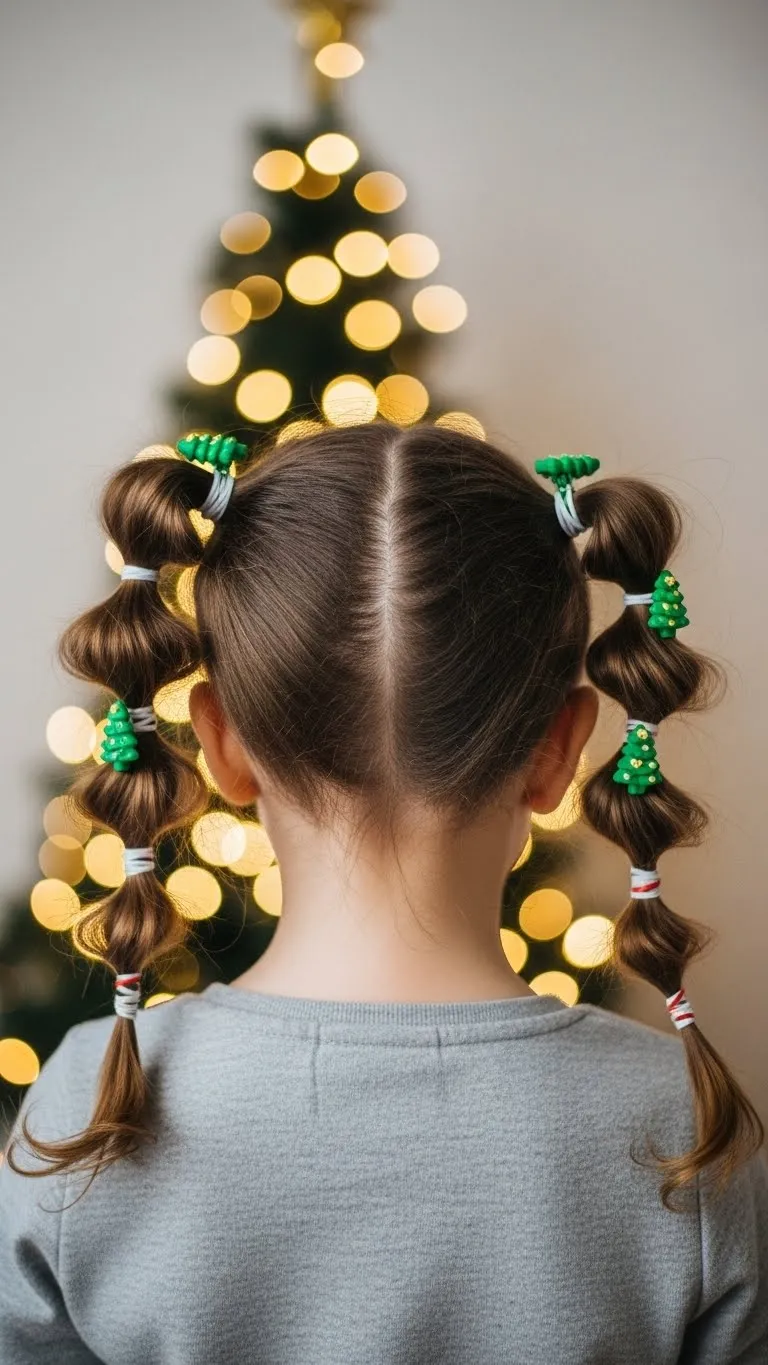 Pigtails are classic and easy to style. Add a Christmas twist by curling the ends or using small green clips to mimic pine-tree shapes. Use soft holders to keep the pigtails secure without pulling. Parents with curly-haired kids can refresh curls with a little water. This style looks adorable for school parties or family gatherings. If you want a fun detail, wrap thin ribbons around the base of each pigtail. It creates a playful holiday feel without much work.