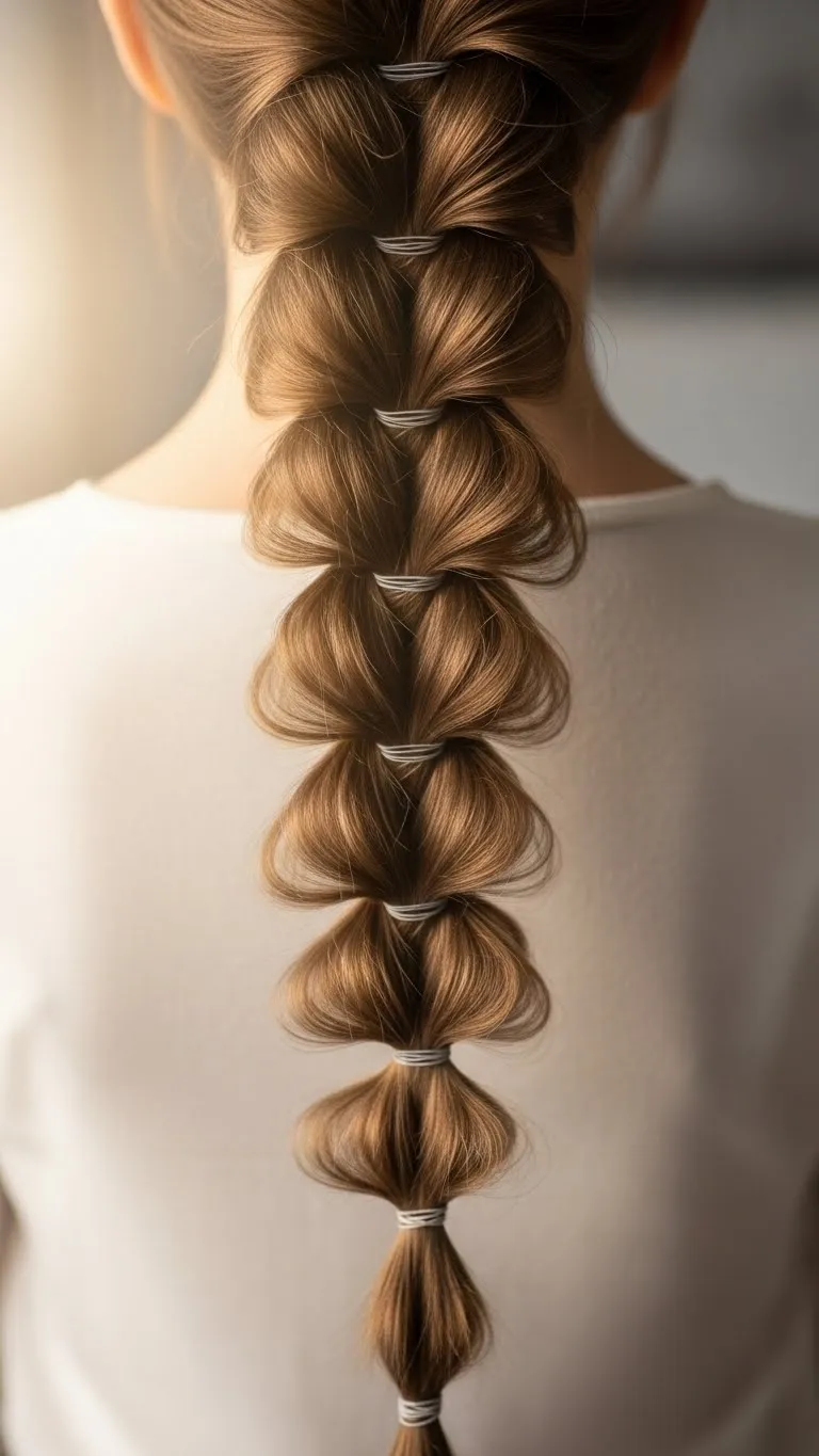 A bubble braid is one of the easiest braid-style looks because it uses elastics instead of traditional braiding. Start with a ponytail, then place elastics down the length, spacing them evenly. Gently pull each section outward to create rounded bubbles. This style adds volume without teasing and works well for thin hair. Clear elastics keep the look clean and simple. It stays comfortable all day and holds its shape even with movement. The bubble braid feels playful and relaxed, making it a good option for casual Valentine activities.