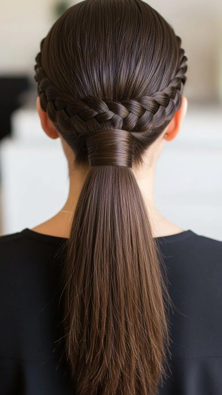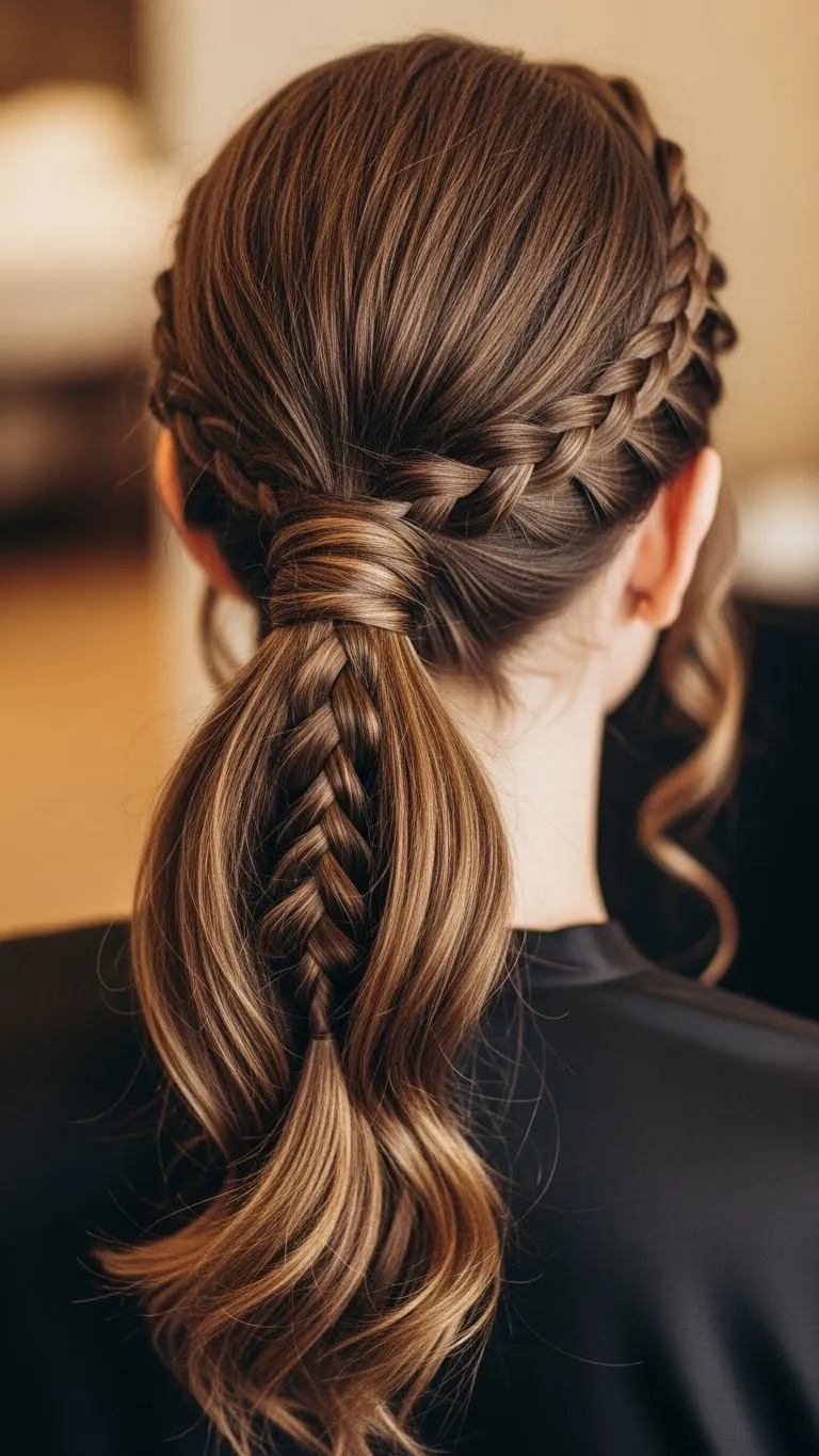 A braided low ponytail feels calm and wearable. Braid the hair first, then secure it low at the nape. This adds texture without making the style heavy. It stays comfortable for long wear and works well with cozy outfits. The braid helps prevent slipping and keeps the ponytail neat without strong products.