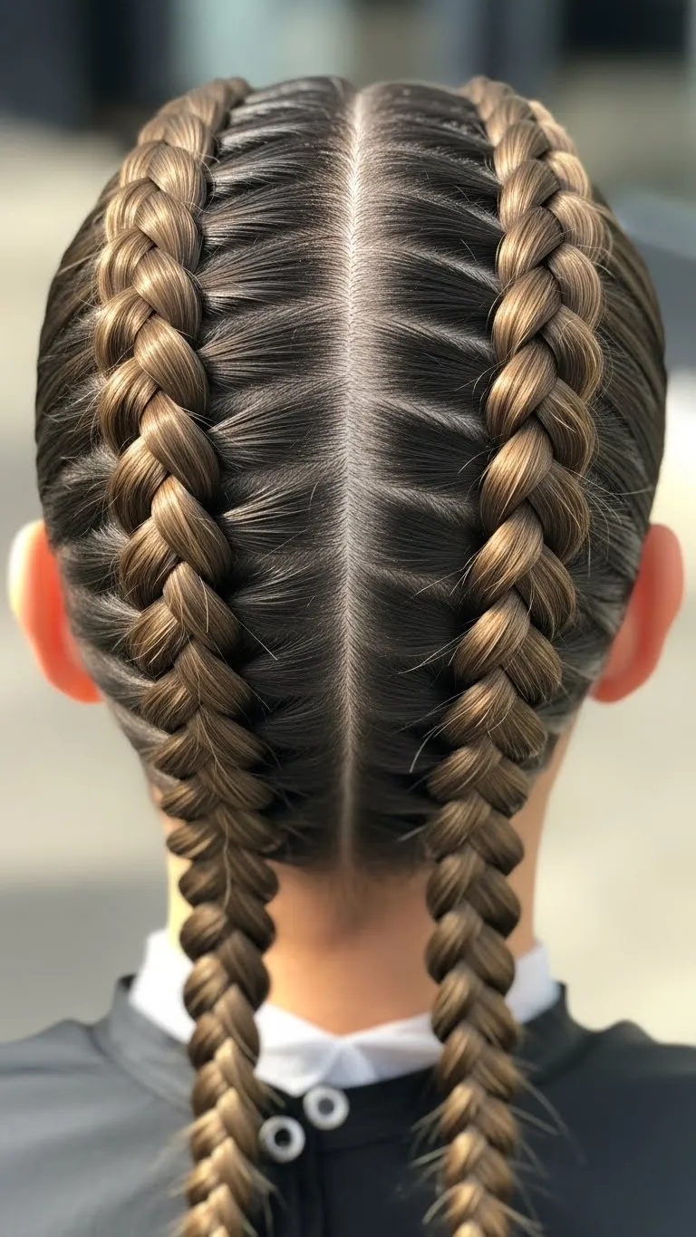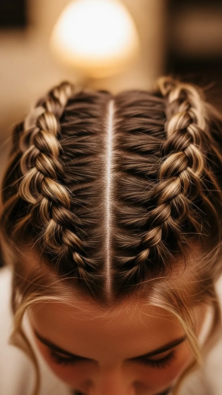 Double Dutch braids feel playful and neat at the same time. Part your hair down the middle and braid close to the scalp, adding hair as you go. Keep the braids slightly loose so they do not feel tight or heavy. This style stays secure for hours and works well for active Valentine plans. You can stop at the nape and leave the ends loose or braid fully. If you want softness, gently pull sections wider after finishing. This braid works well on all hair textures and keeps hair controlled without heat tools. It is also budget-friendly since it requires no products beyond elastics.