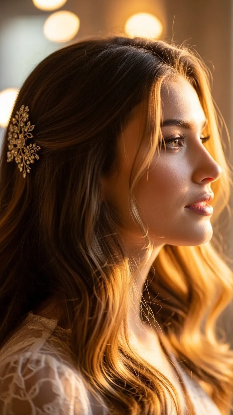 A side clip is a simple way to style long hair for Valentine’s Day without effort. Lightly curl the hair and secure one side back with a small clip. This keeps hair off the face and adds detail without heaviness. The style remains easy to adjust and looks softer as the curls relax throughout the day.