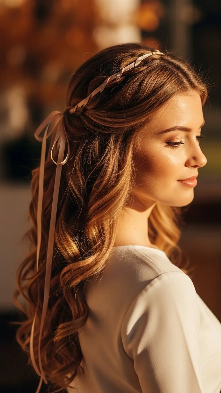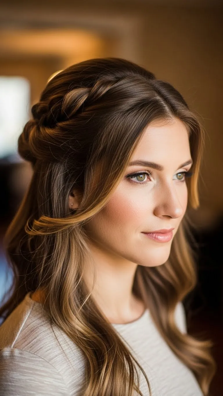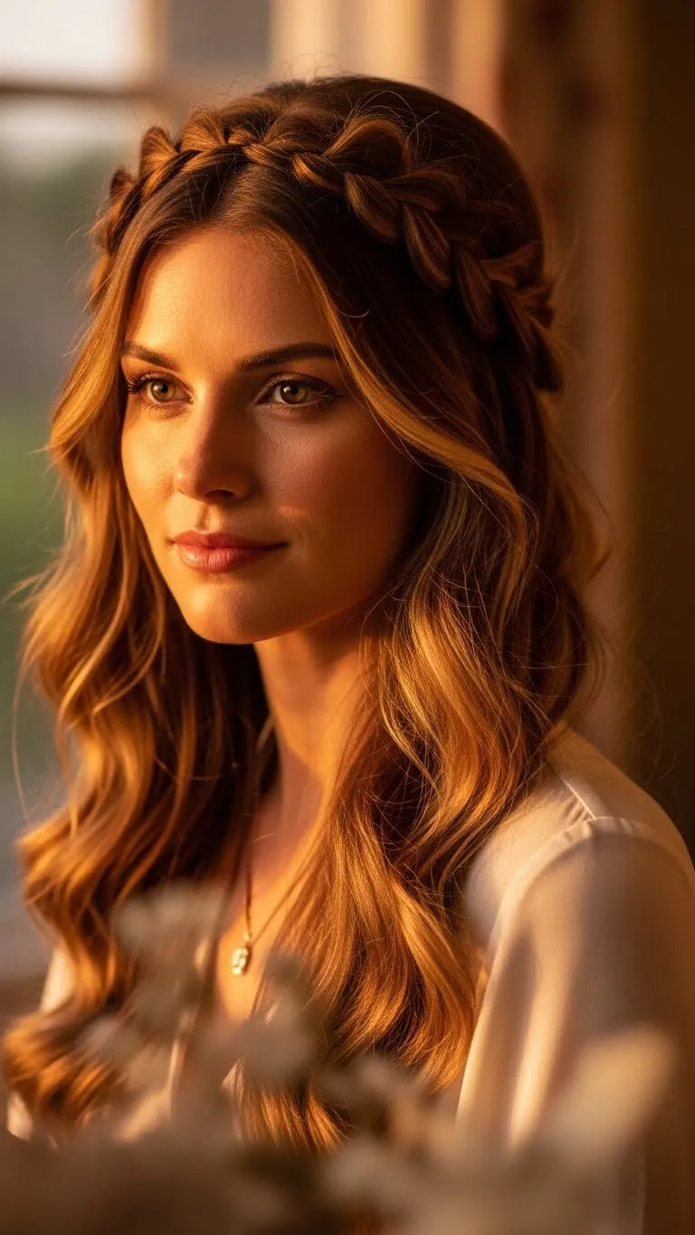 A soft braided crown adds romance without feeling tight or heavy. Create a loose braid along one side and guide it gently across the crown, securing it lightly. The rest of the hair stays loose with waves or curls. Avoid pulling the braid too snug so the scalp remains relaxed. This style frames the face beautifully and stays comfortable for hours. As the day passes, the braid softens and blends into the waves, making the hairstyle feel even more natural.
