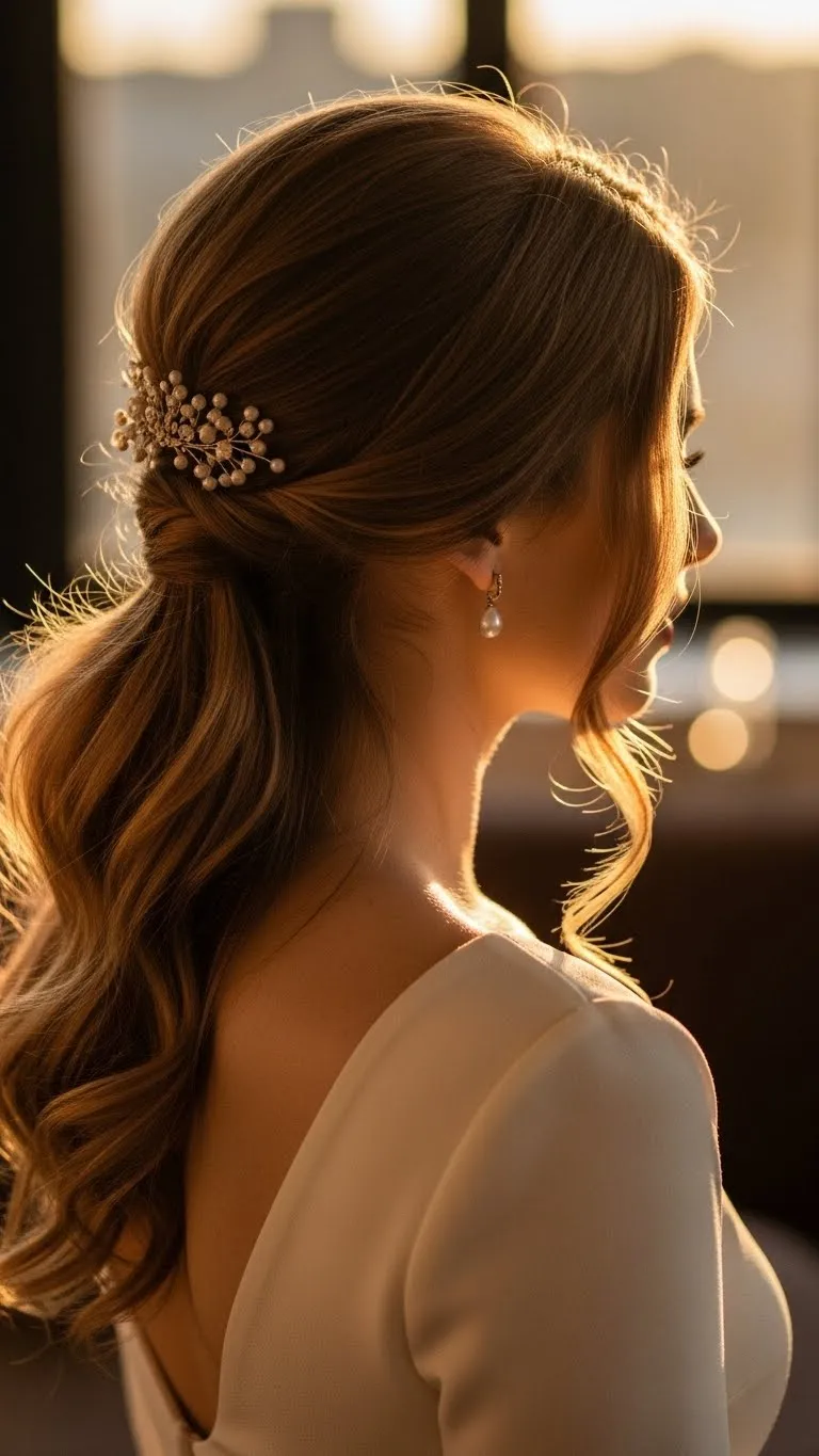 A low half-up style is ideal for long hair when comfort matters. Gather the top section lower than usual and secure it gently to avoid scalp tension. The remaining hair stays loose with soft waves, creating balance and movement. This style works well for long events because it keeps its shape while still allowing natural loosening. It feels light and looks polished without effort.