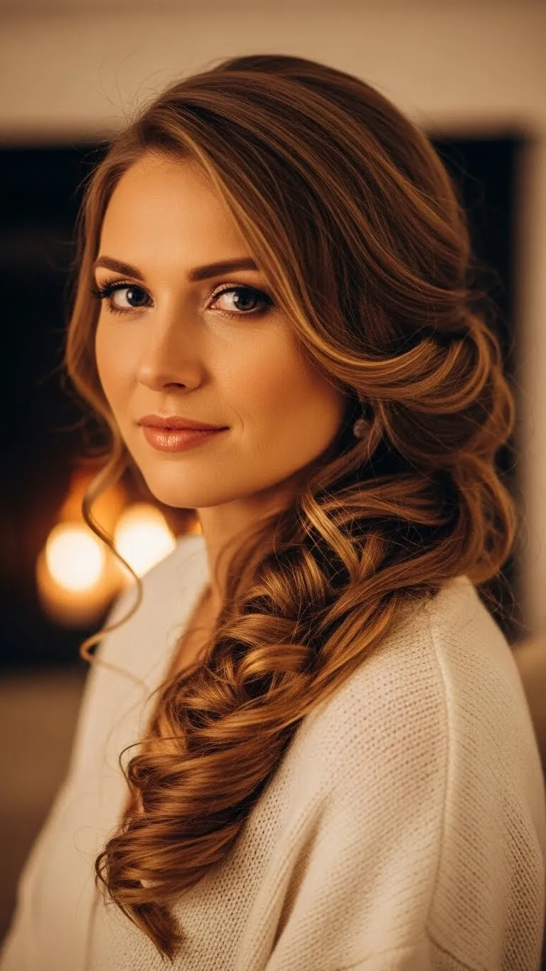 Side-swept curls create a romantic shape that highlights the length of long hair while framing the face beautifully. After curling the hair evenly, guide most of it over one shoulder and secure lightly at the back if needed. This style feels balanced and comfortable and works especially well for long dinners or evening plans. The curls blend together as they soften, creating a natural wave pattern instead of falling flat. This hairstyle looks intentional from every angle and pairs well with both simple and dressy outfits.
