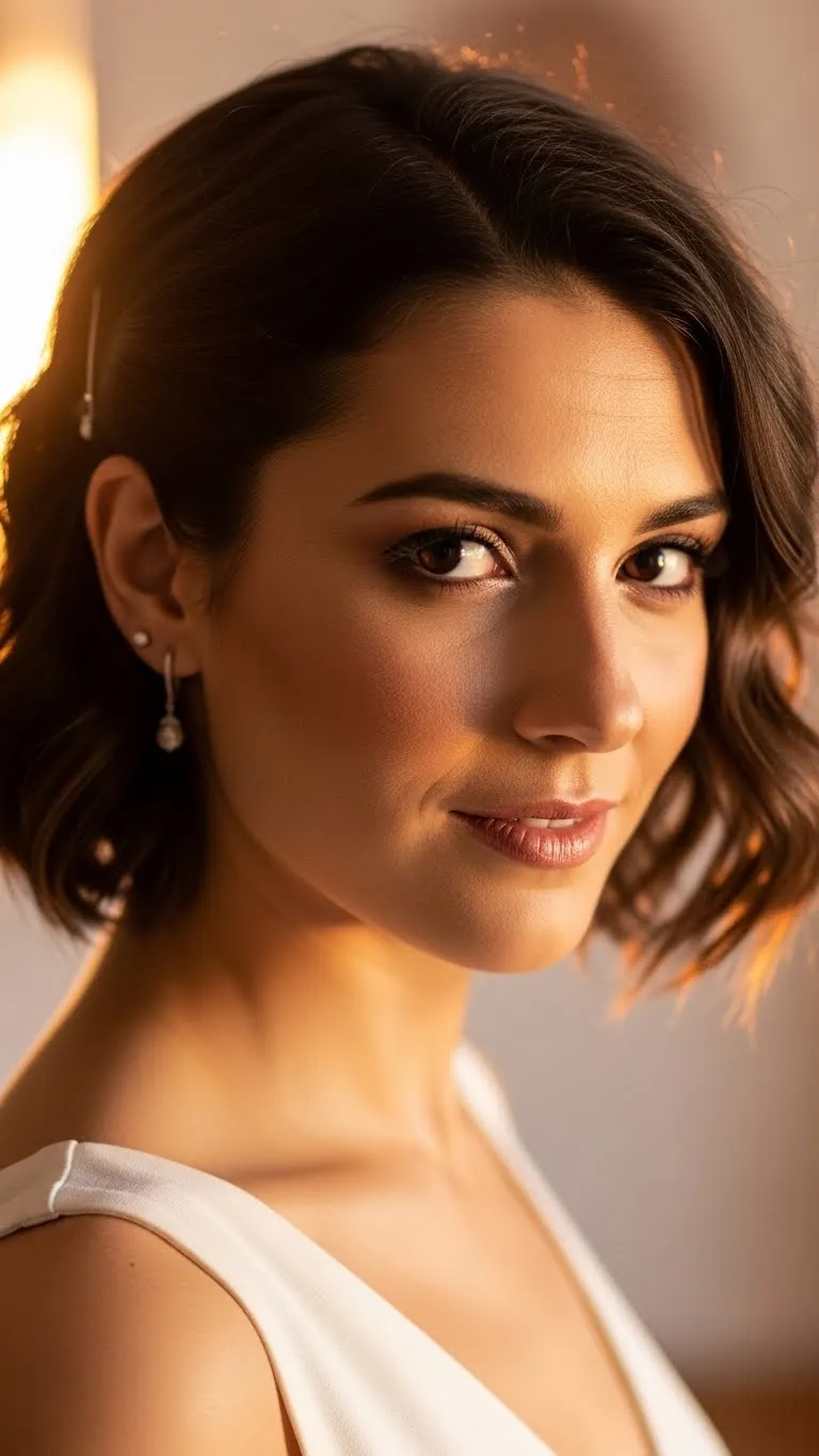 Styling short hair away from the face creates a clean and romantic effect that highlights facial features. This can be done by directing the front sections back with a light styling cream or blow-drying them slightly upward. The result feels polished while still remaining comfortable and wearable. This hairstyle stays in place naturally and works well for events where you want your hair to feel neat without looking overworked.