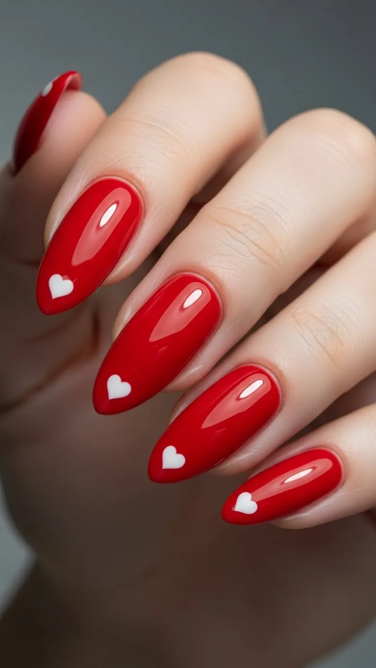 Classic red nails paired with tiny heart accents create a timeless Valentine look that always photographs well. The bold red base gives strong color payoff, while the small hearts add detail without crowding the nail. Keeping the hearts near the cuticle or on one accent nail helps the design stay clean. This style works for short and long nails and suits both casual and dressed-up outfits. For a budget-friendly approach, a toothpick or pin works well for dotting hearts at home. A glossy top coat smooths everything out and keeps the color vibrant in photos.