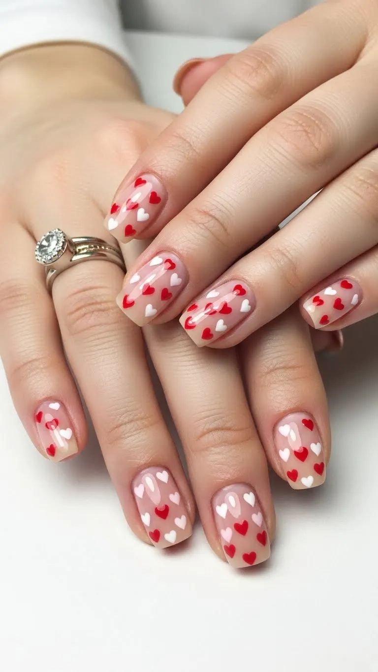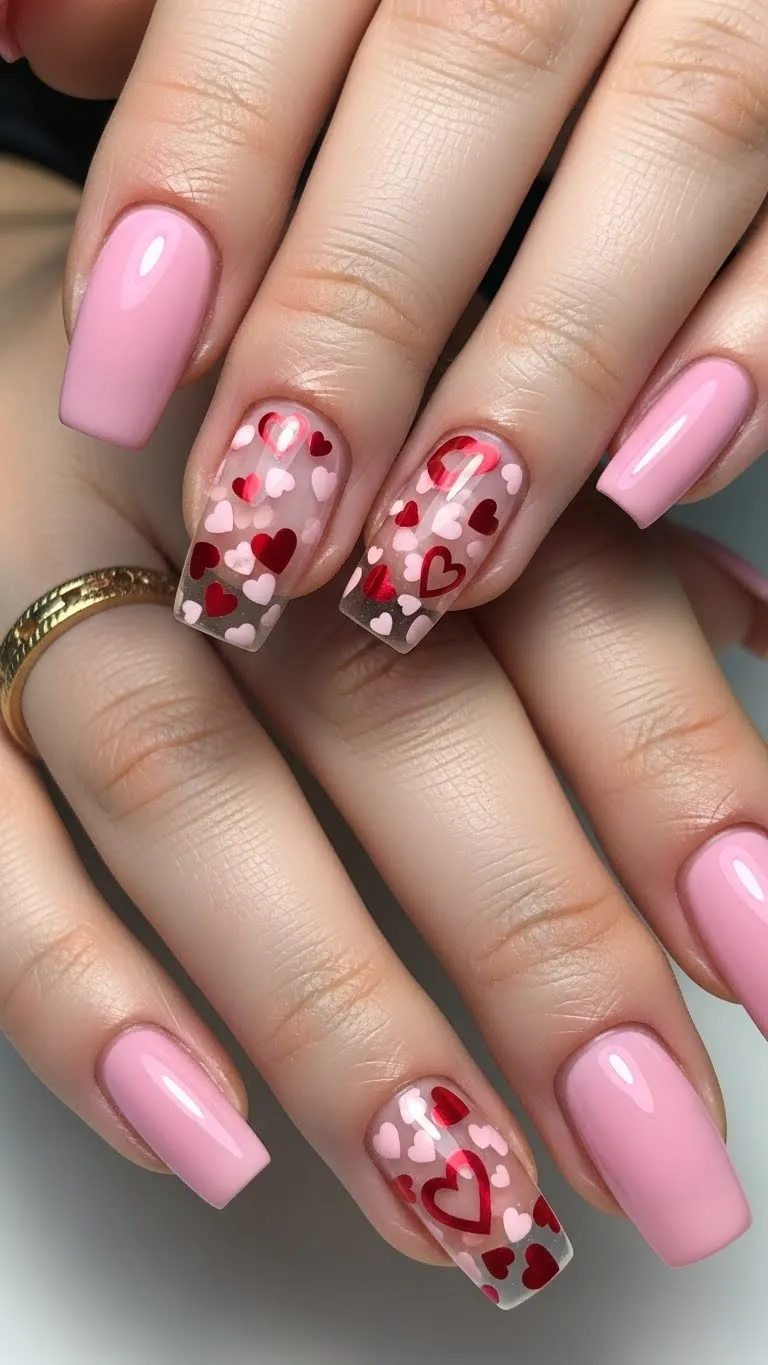 Sheer pink nails with floating hearts create a layered look that instantly grabs attention in photos because the design appears suspended rather than painted on top. The transparent base allows light to pass through the nail, which adds depth and makes the hearts feel weightless and playful. This style works especially well for people who want Valentine nails without bold color coverage. Using thin heart decals or tiny confetti pieces keeps the nails looking clean instead of crowded. At home, this can be recreated by applying a sheer pink polish, placing hearts while the layer is tacky, and sealing with clear gel. Smooth sealing is important so the surface looks glassy and photo-ready. This design looks good on both short and long nails and performs well in natural light photos where the layered effect is more visible.