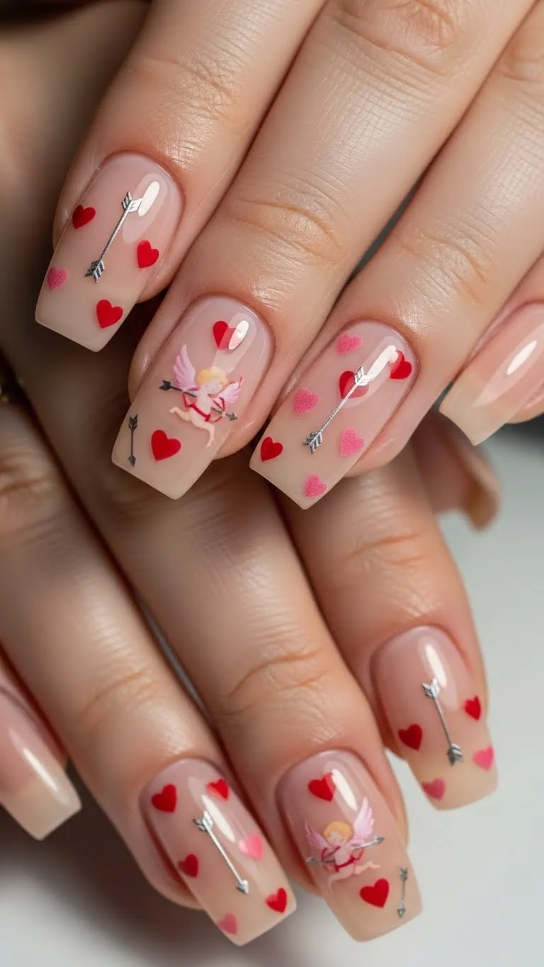 Valentine nail stickers on a nude base offer an easy way to achieve themed nails quickly. The nude background keeps the look polished and flattering. Stickers provide uniform shapes, which helps the nails look consistent in photos. This method saves time and reduces the need for steady hand skills. Sealing the stickers with a strong top coat prevents lifting and keeps edges smooth. This style works well for beginners and budget-conscious designs.