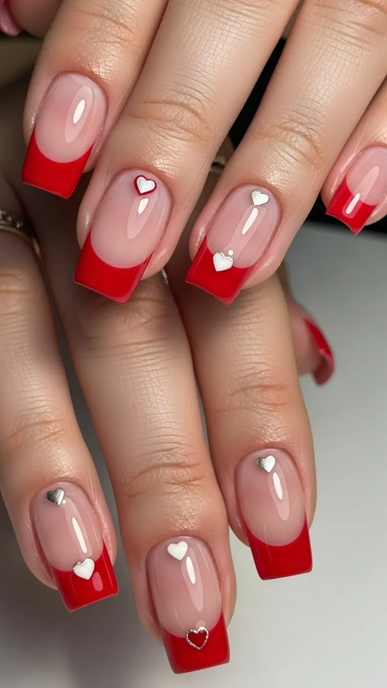 Red French tips paired with heart details create a bold yet organized Valentine look. The structured tip keeps the nail shape clean, while hearts add a playful romantic touch. Using a nude or pale pink base prevents the red from feeling too heavy. This style photographs well because the contrast between base and tip remains clear. Nail tape or guides help achieve even tips at home. Placing hearts near the tip or cuticle adds interest without clutter. A glossy finish enhances color depth and shine.