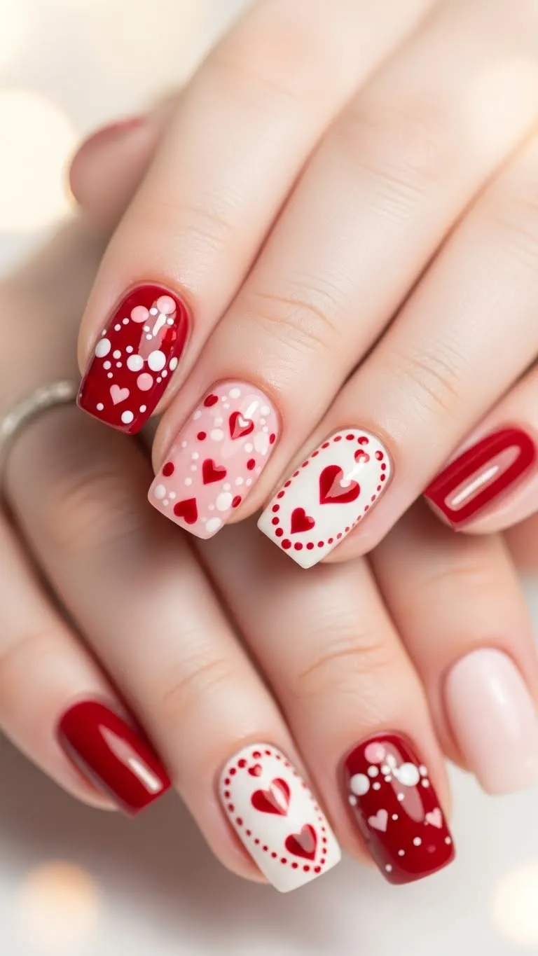 Dot and heart patterns create playful Valentine nail designs that feel approachable and fun. Dots help guide the eye and balance heart shapes across the nail. Using red, pink, and white keeps the theme clear. This design is easy to recreate using basic tools like pins or dotting sticks. Keeping spacing even avoids clutter. A glossy top coat smooths the surface and improves photo clarity. This style works well for casual wear and short nails.