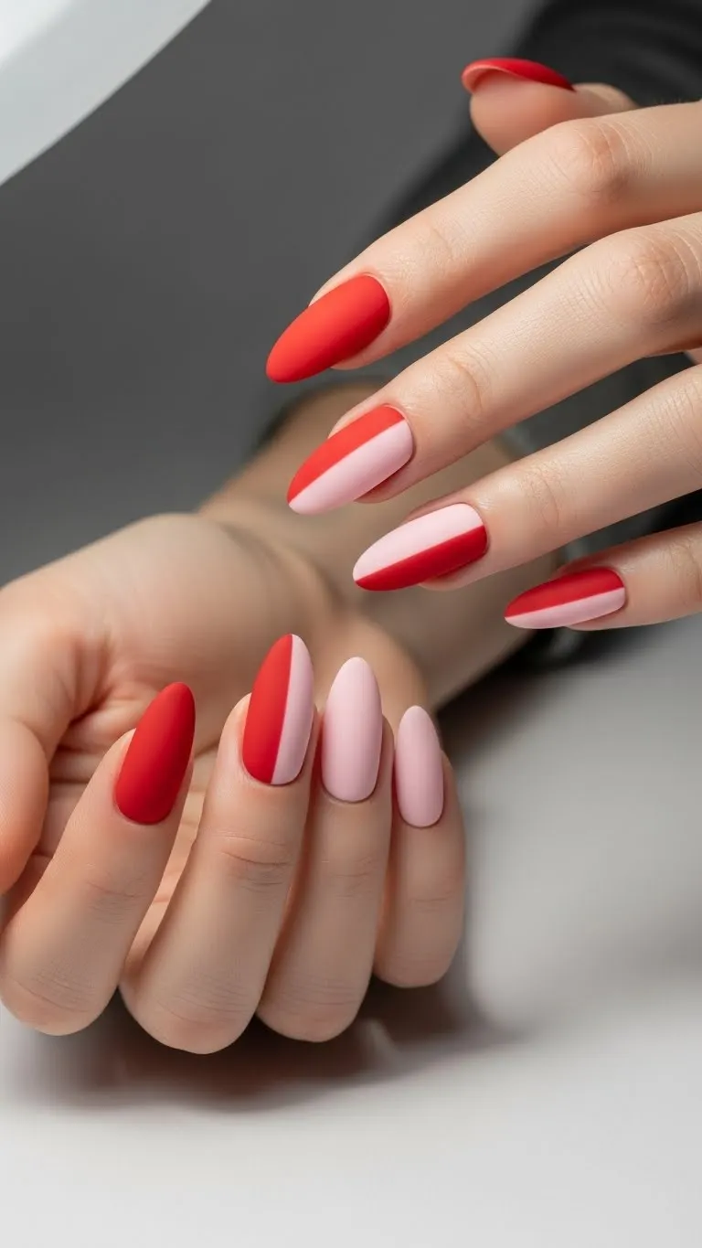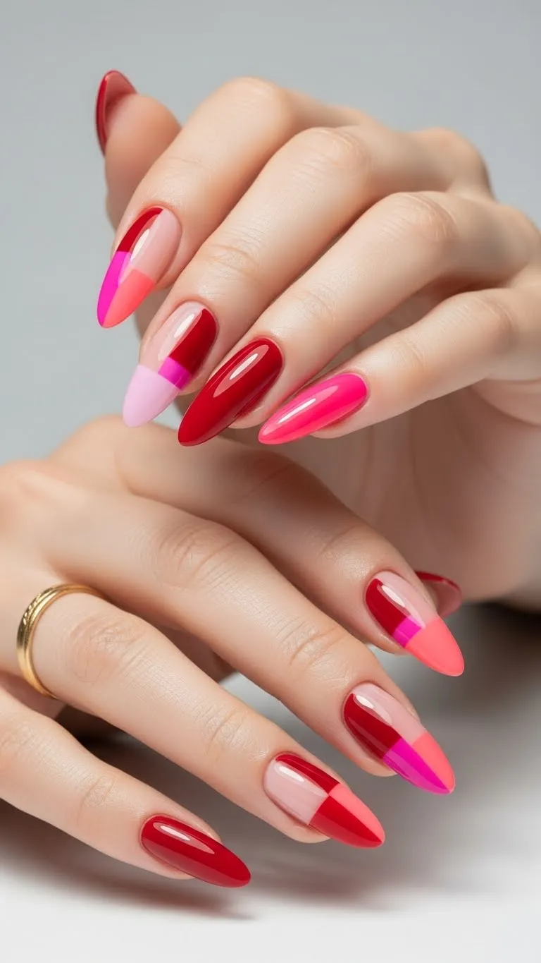 1. Red and Pink Color Block Valentine Nails