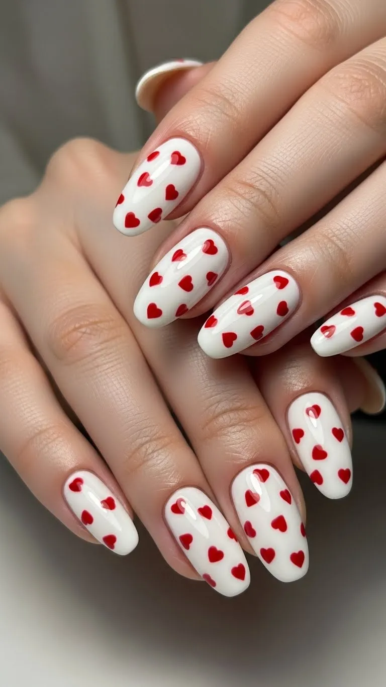 White nails with scattered red hearts create strong contrast that reads clearly in photos. The white base reflects light evenly, making the hearts stand out. Keeping the hearts small and evenly spaced prevents clutter. This style is easy to recreate using nail stickers or stamps, which helps save time and money. It works especially well for short nails and feels playful while staying neat.