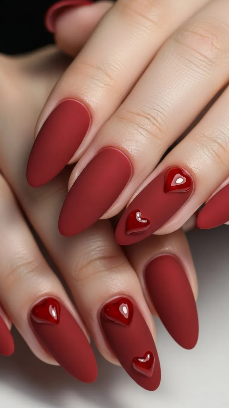 1. Matte Red Nails With Glossy Hearts